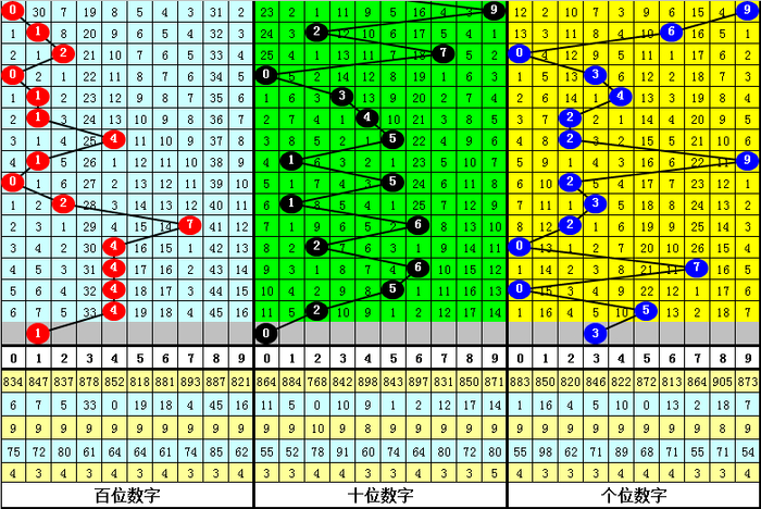 百位上期出现:热号4,该位连续十期以热号出现较多,以冷号出现较少,本期该位温号有2个:0、1,看好温号转热,关注号码1。