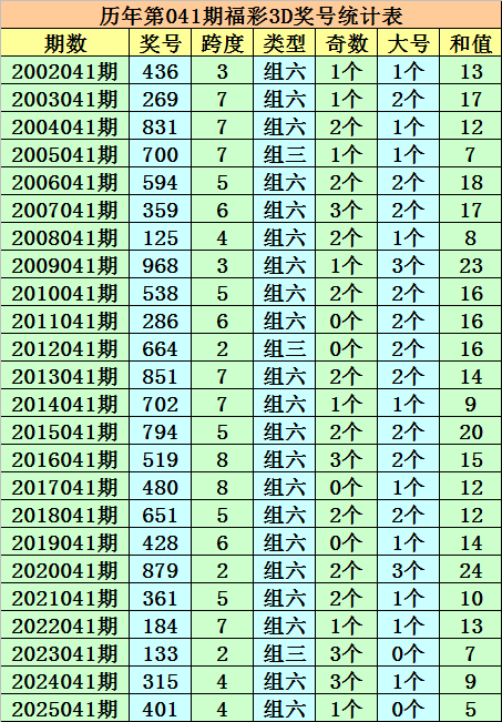 历年第041期福彩3D同期奖号为:436 - 269 - 831 - 700 - 594 - 359 - 125 - 968 - 538 - 286 - 664 - 851 - 702 - 794 - 519 - 480 - 651 - 428 - 879 - 361 - 184 - 133 - 315 - 401。