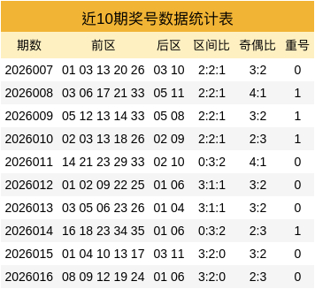 近10期前区的三区比为20:20:10,其中前1、2区出号数较多,3区前区出号数较少。上期前区三区比为3:2:0,1区前区表现较强。本期关注三区比1:3:1。